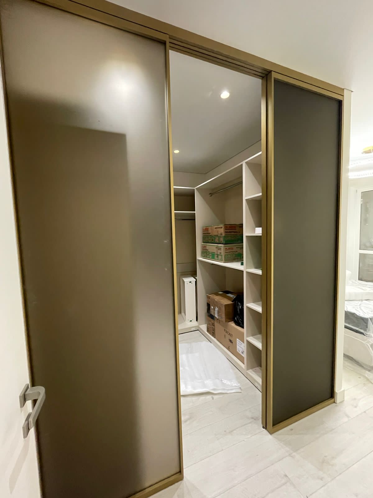 Конструкция состоит из одного подвижного и двух стационарных полотен, что позволяет перекрывать широкие проёмы и создавать эффект единого пространства между комнатами.