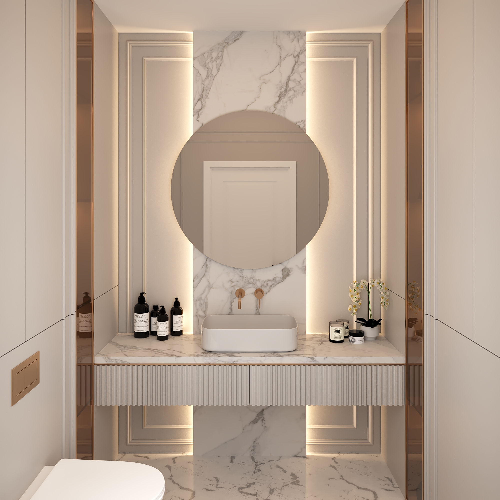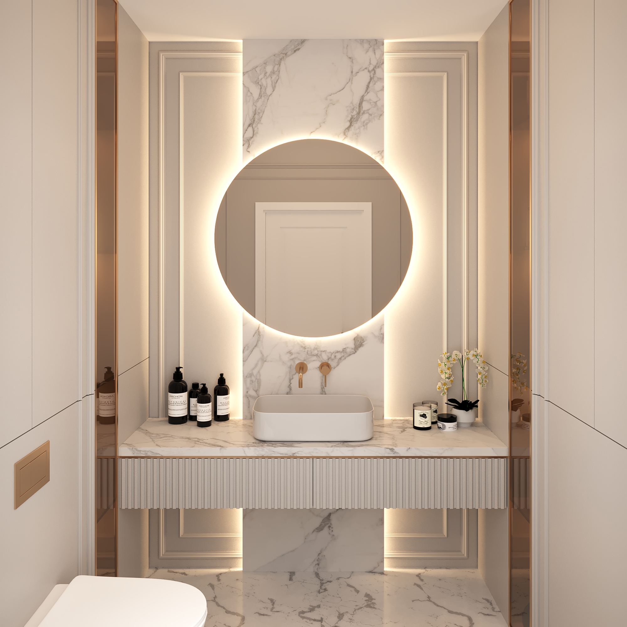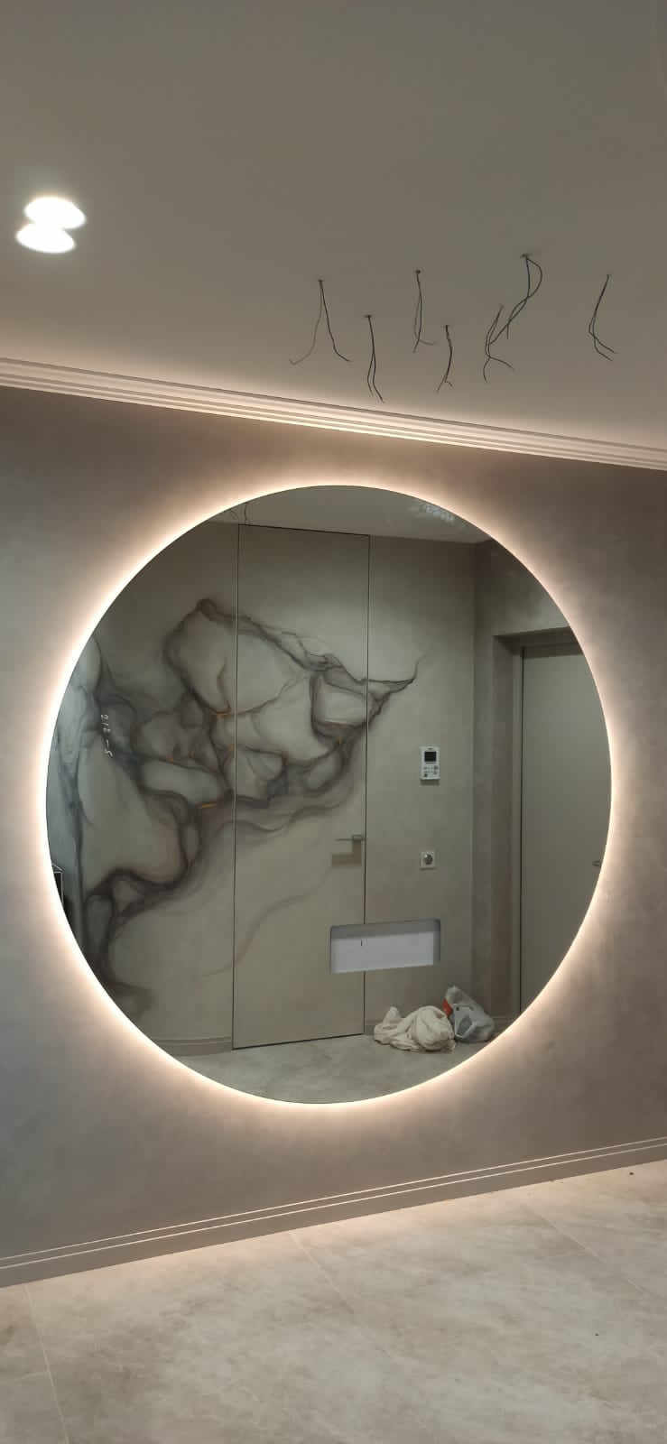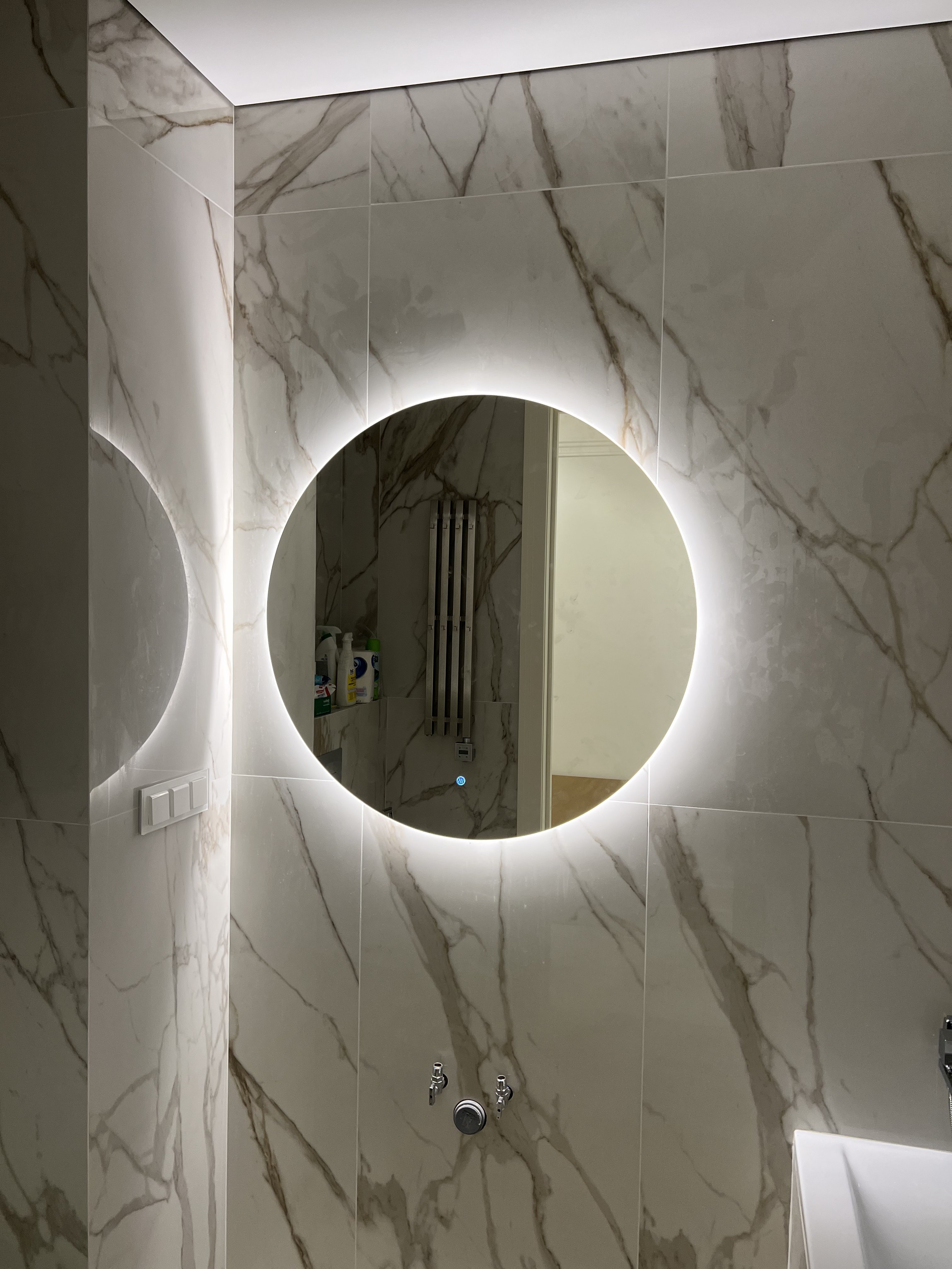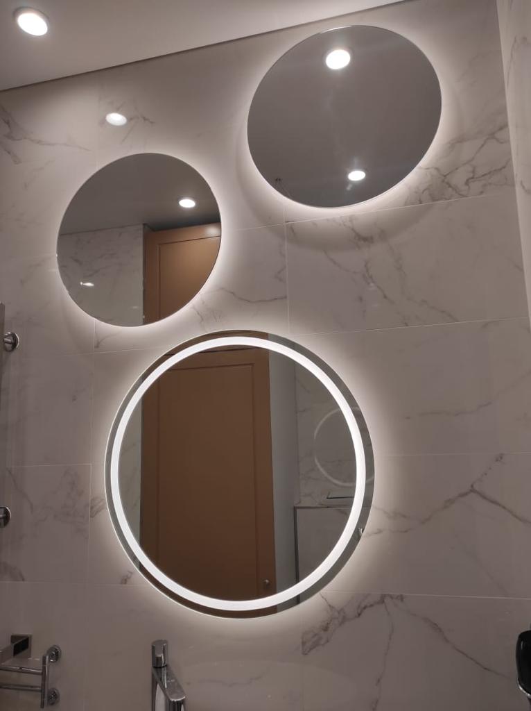 Эффектное круглое зеркало с мягкой контурной подсветкой, создающее ощущение парящего света. Чистая геометрия формы в сочетании с деликатным свечением формирует визуальный центр интерьера и наполняет пространство атмосферой уюта и статуса.