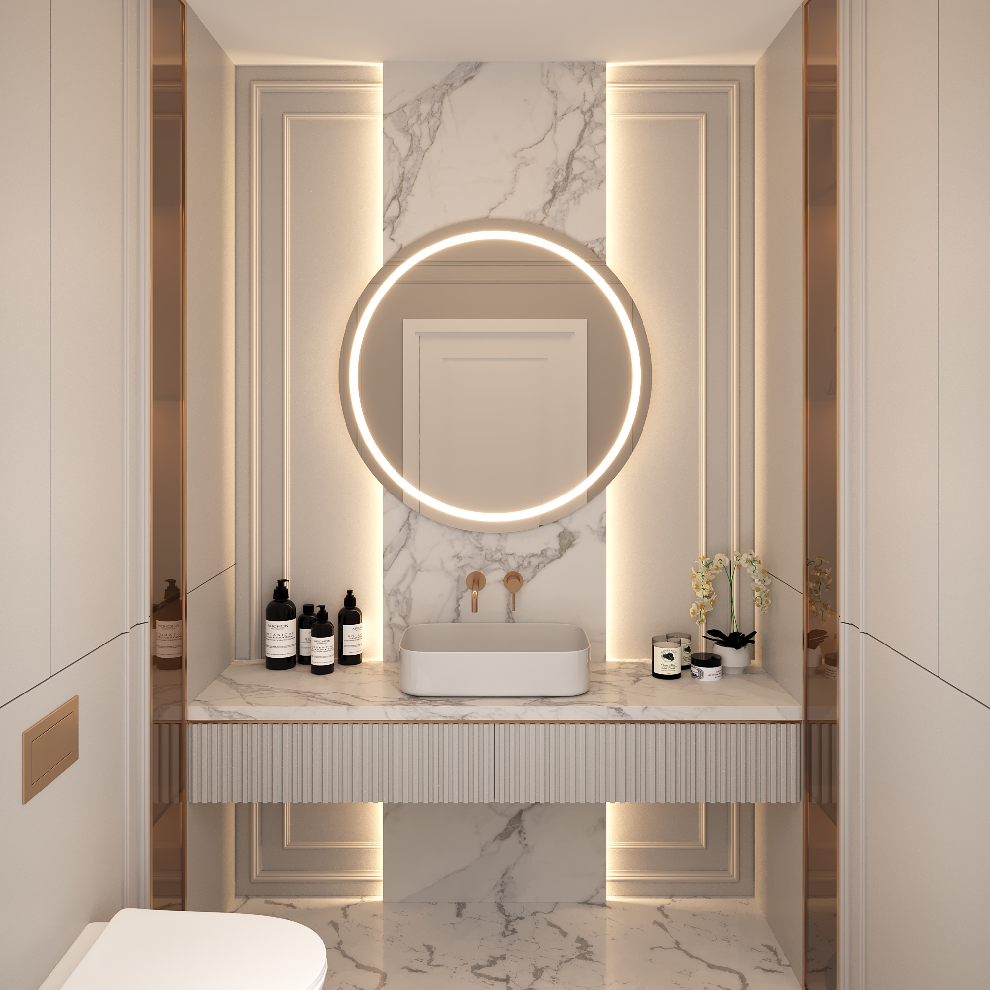Круглое зеркало с выразительной LED-подсветкой — это не просто функциональный элемент, а центральный акцент интерьера. Чистая форма круга и идеальный световой контур создают эффект «светового ореола», наполняя пространство мягким, обволакивающим светом.